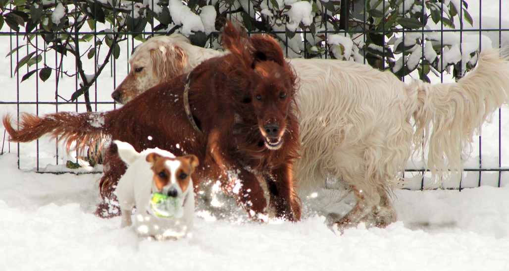 It snowed and at the tail end of the snowstorm, Wendy and I went to the park. There we found Clio the Red Setter and Thelma, the English Spaniel mix. Wendy grabbed the ball when Clio was distracted and raced for cover (between my feet) with her prize in her mouth. Clio, never a slouch, spied what was up, gave Wendy the chase, and crashed into me. Into the white I fell, laughing, my camera wet, but intact.