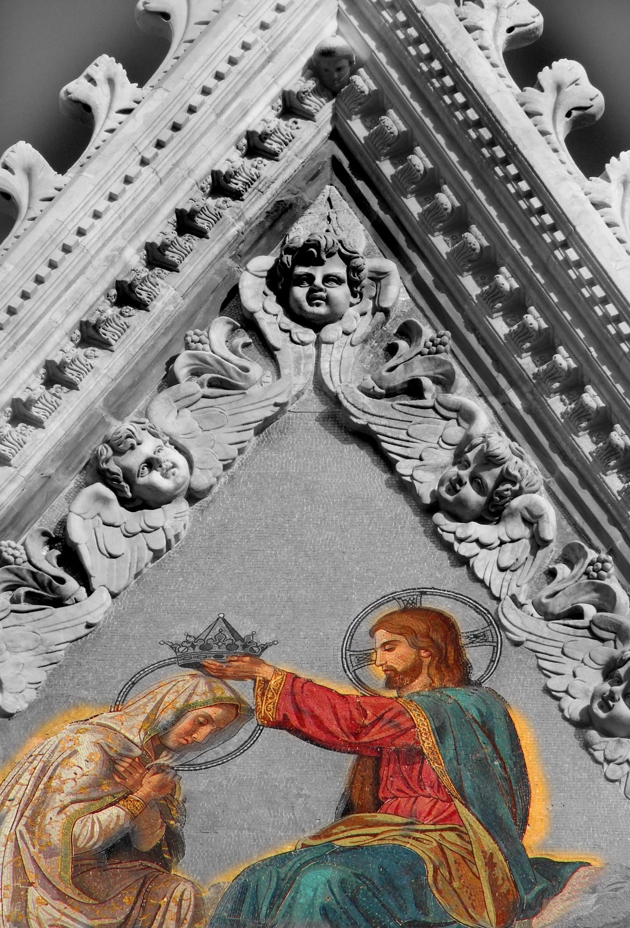Visiting the cathedral in Siena (that gem of a town nestled in Tuscan hill country), I kept returning to admire the pinnacle decoration on the facade with its marble putti and golden mosaic. The Coronation of the Virgin. Hundreds of meters above me the gigantic image glowed in the pale winter sun, a neon-like mirage flashing.