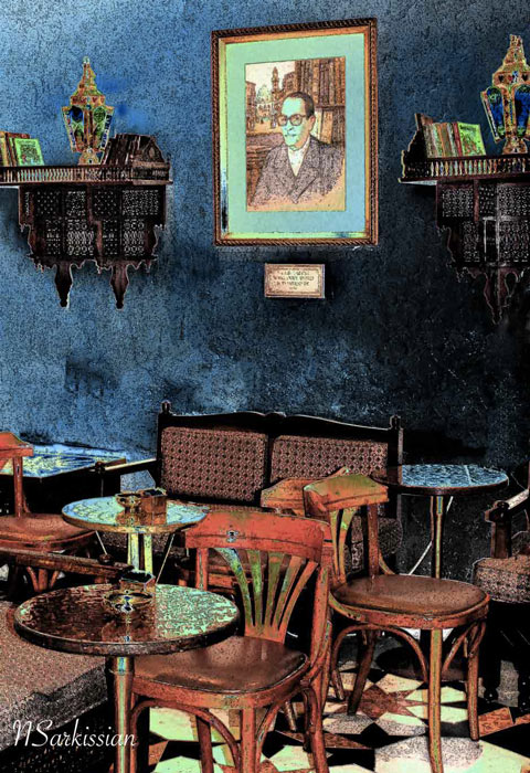 Last summer I was in Cairo, where my husband goes on business, and took the opportunity to investigate the Khan el-Khalili souk and the neighboring El-Gamaleyya district, a medieval Islamic section of the city celebrated in the work of the Nobel Prize-winning Egyptian writer Naguib Mahfouz. My second day in the city, I toured the Sultan Qala’un funerary complex with its polychrome mosaics and then on to the Naguib Mahfouz Café where Mahfouz had sat, the manager assured me, drinking tea, observing and writing. Now a plush restaurant operated by Oberoi hotels, the Café caters to the wealthy tourist and, as a result, has been emptied of the characters that would have appealed to Mahfouz.