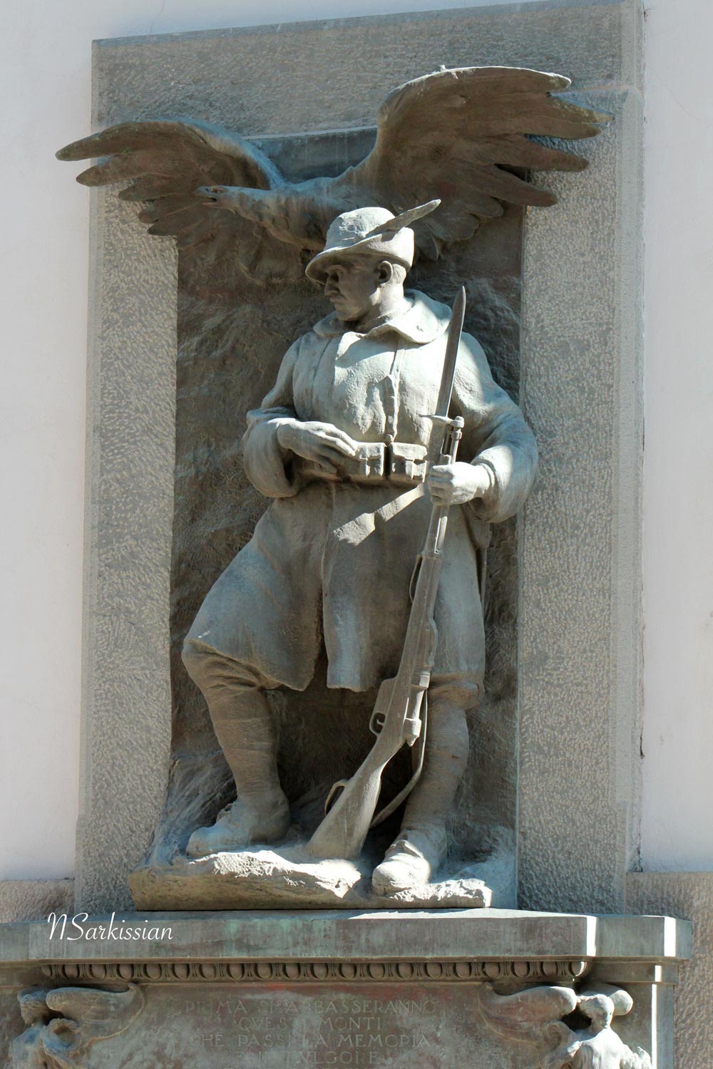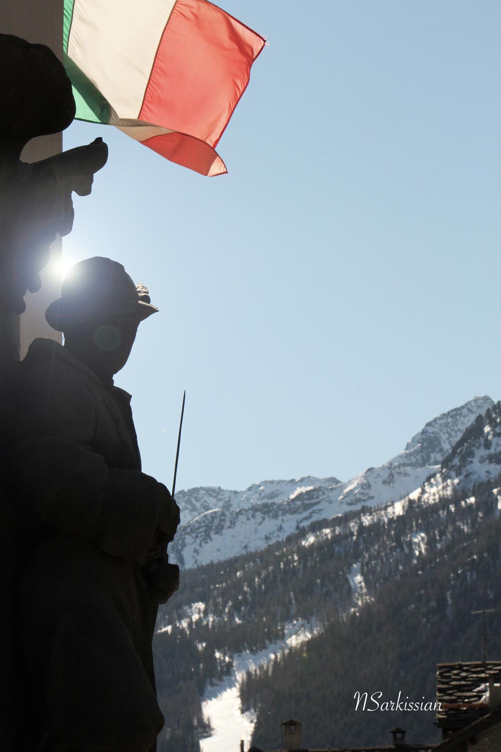 This bronze Alpine soldier stands ever vigilant near a mountain pass at Gressoney-St. Jean, in Val d’Aosta. Now traversed with ski trails, here are peaks that troops once climbed across at nightfall. Many never returning.