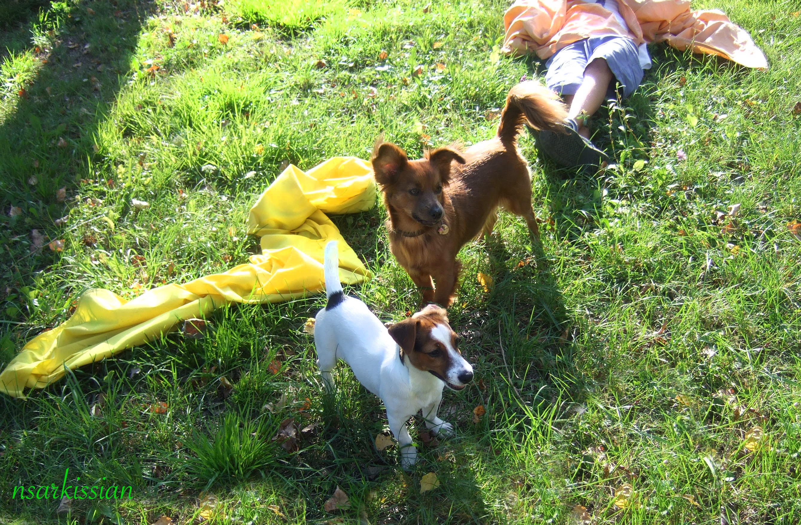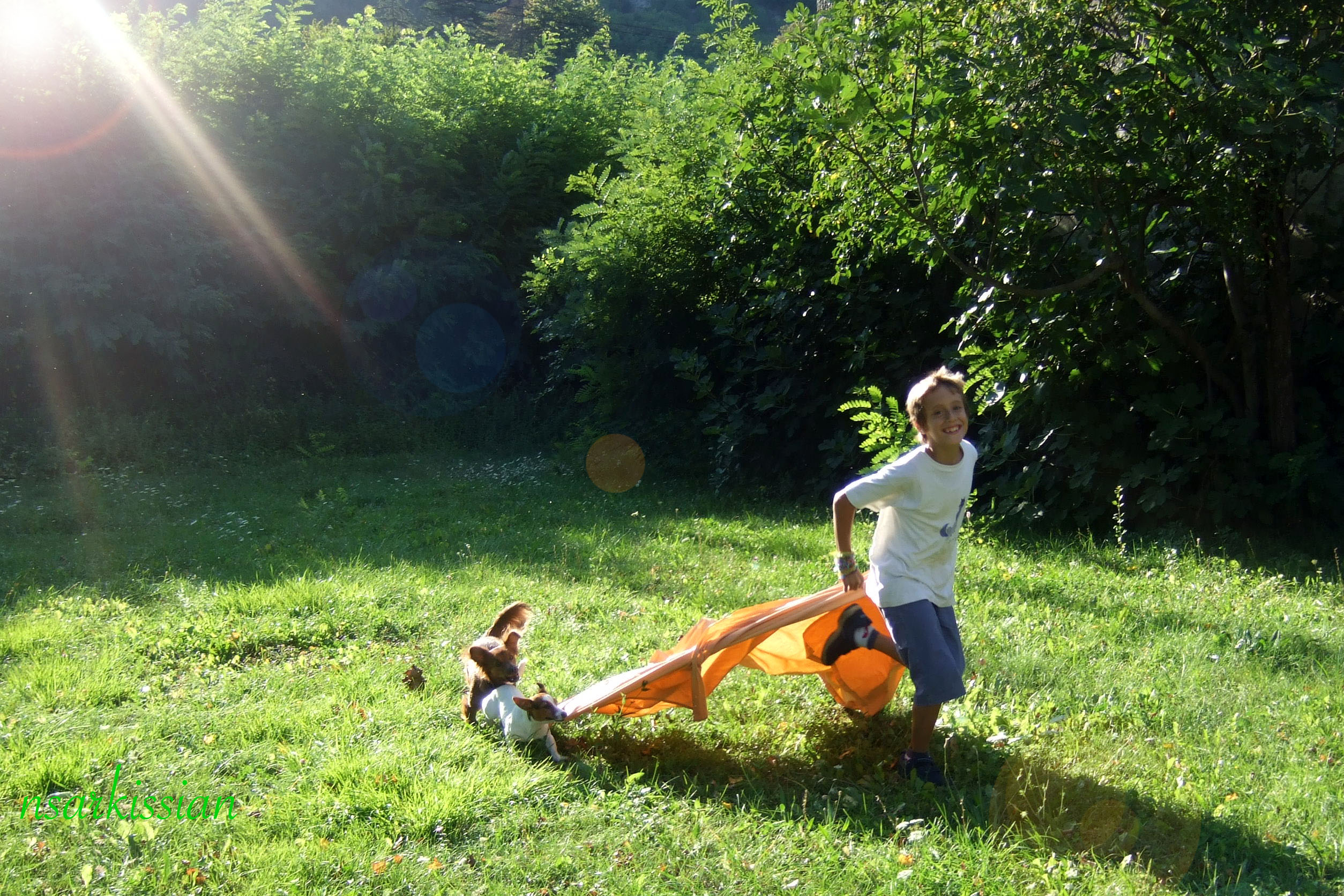 a boy and two dogs play tug of war.