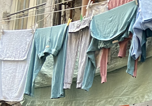 No doubled clothing. Sheets in front. Pillowcases are paired. Smaller items are toward the back. Intimate items like socks and underpants are hidden completely from view on the clothesline nearest the balcony railing. In addition, these items look as if they’ve been brightened with bleach. The overall effect is one of modesty. No, of purity. Assunta kissed her fingertips bunched like a flower.